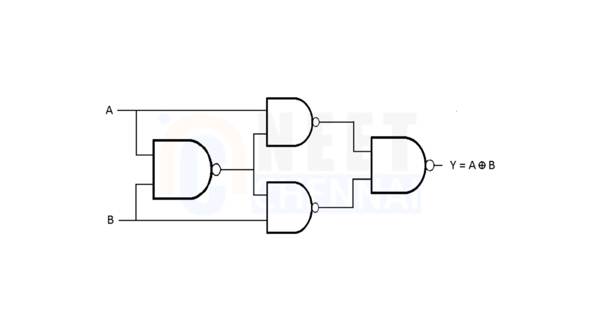 An example of constructing an XOR gate using NAND gates is illustrated below:
